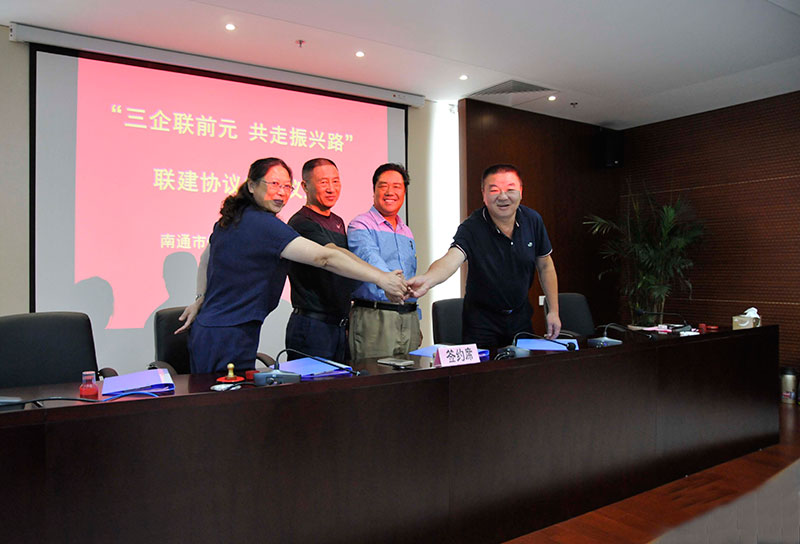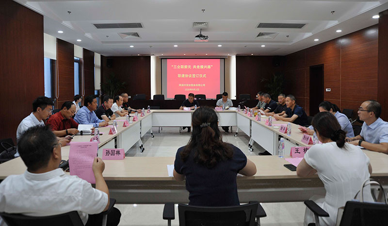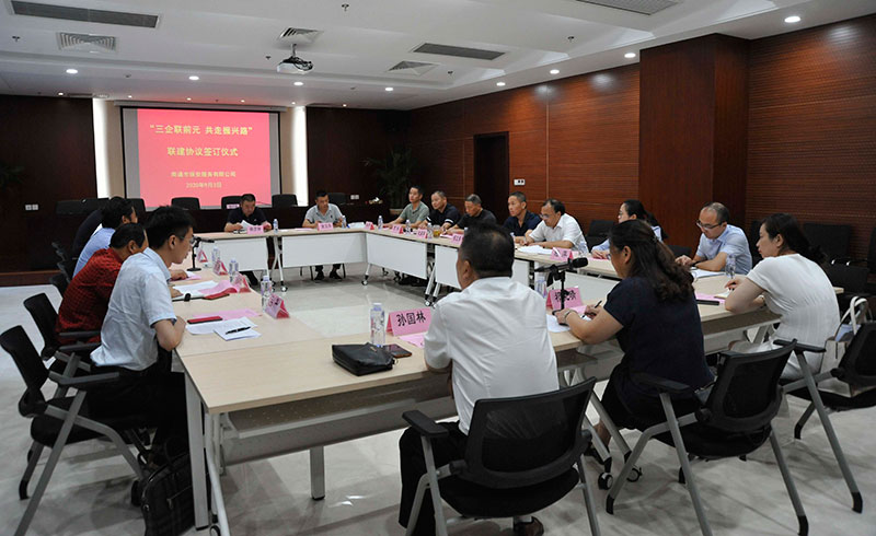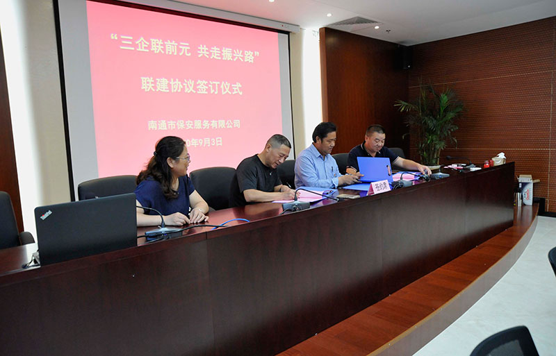 9月3日上午,“三企联前元,共走振兴路”联建签约仪式活动在保安公司四楼会议室成功举行。城建集团下属南通市保安服务有限公司、南通市绿化造园开发有限公司、南通国信资产管理有限公司三家子企业与连云港东海县黄川镇前元村签订联建协议。连云港东海县黄川镇副书记朱斌一行6人,国资委副调研员郁卫东、党群处处长曹权、城建集团副总经理朱红军以及保安公司等三家企业的负责人出席了签约仪式。