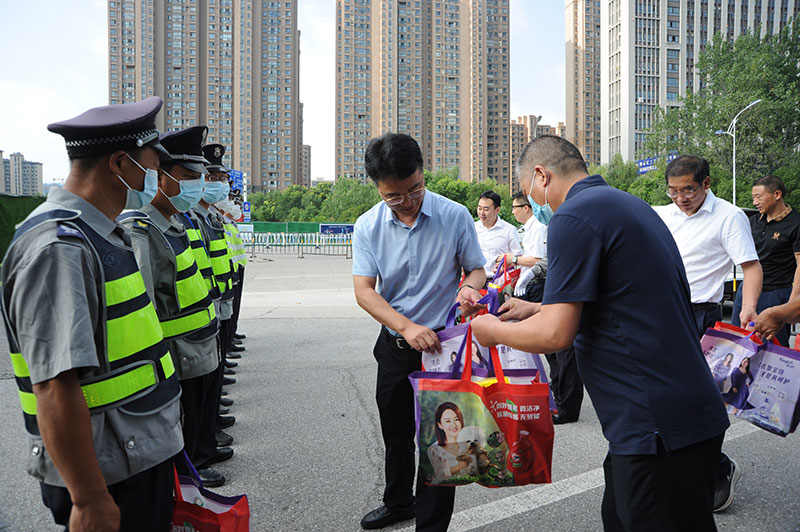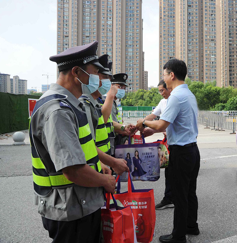夏日酷暑,烈日炎炎。近日来,南通地区持续高温天气。城建集团领导则心系着户外高温作业的一线员工,开展了“送清凉、促安全、防疫情”高温慰问活动。8月3日上午,城建集团党委书记、董事长张建中,副总经理朱建林、副总经理董新平、工程管理部部长冒俊、办公室主任万晶一行在保安公司董事长沈鑫华的陪同下,看望、慰问了户外高温作业的一线保安队员,向他们送上了集团领导的关怀与问候。