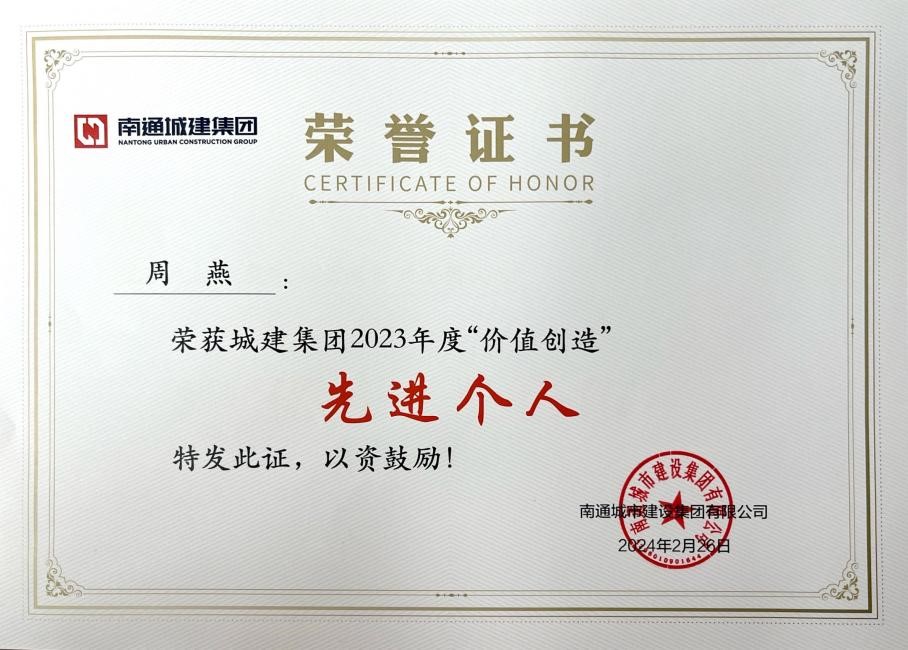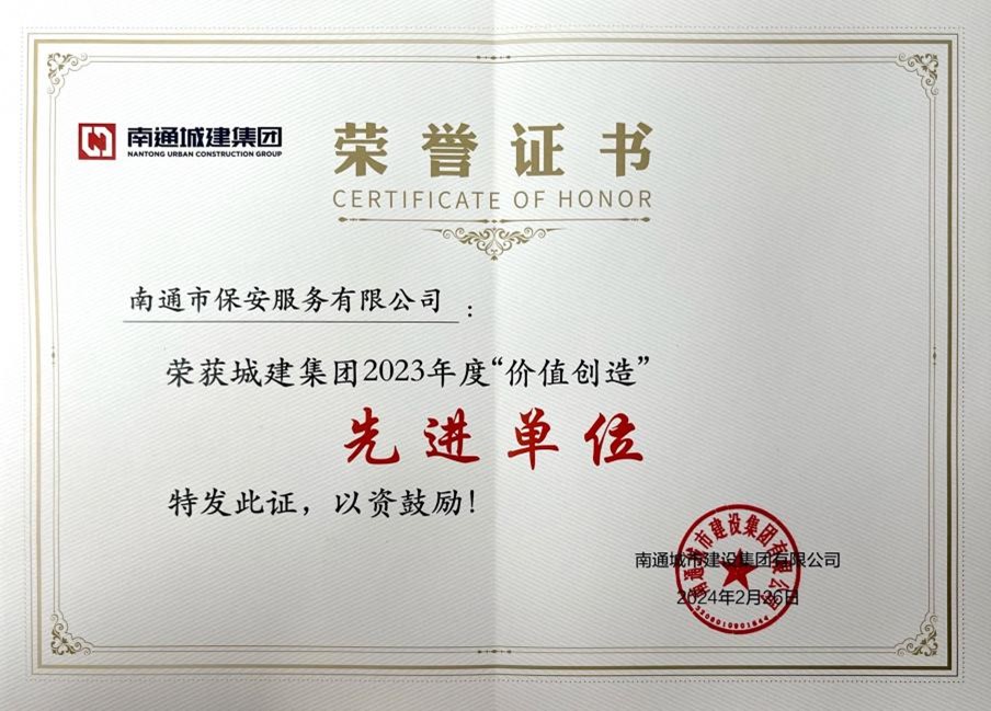 2024年2月26日,南通城市建设集团有限公司举办了2024年度经营工作会议,南通保安公司荣获城建集团“2023年度‘价值创造’先进单位”称号;银行网点“四类库”运营项目 攻坚团队荣获城建集团“2023年度‘价值创造’优秀攻坚团队”称号;红旗驾培周燕荣获城建集团“2023年度‘价值创造’先进个人”称号!