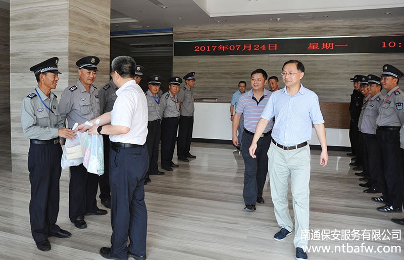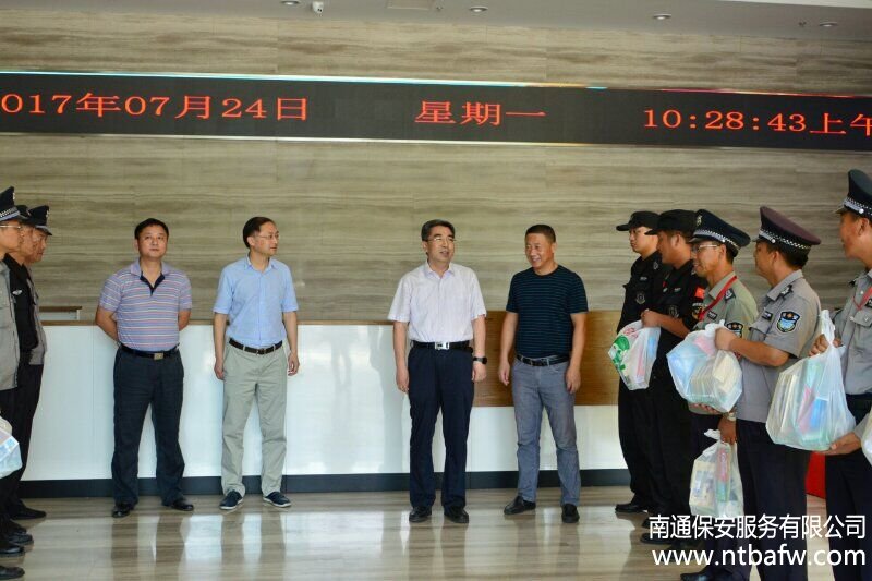 7月24日上午,城建集团董事长李维贤、副总经理施焱、朱峭嵘在公司董事长沈鑫华等陪同下,慰问了冒高温坚守一线岗位的保安队员,送上了防暑降温用品。