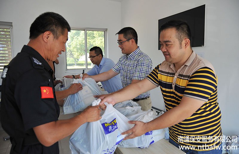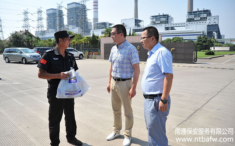 连日来,高温持续。对于坚守在一线岗位的保安队员,牵动着公司领导的心。7月25日,公司总经理方俊、总经理助理袁杰、工会副主席陆益辉慰问了行政中心、华能电厂、默克公司等驻点保安队员,送上防暑降温用品,并仔细询问队员的作息时间和工作情况,嘱咐队员做好防暑降温工作。